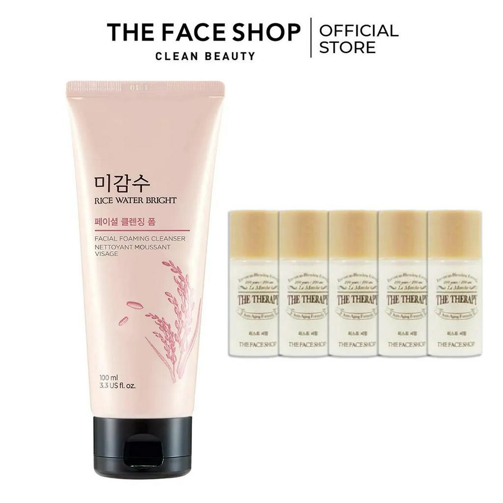COMBO GỒM 1 (GWP) Sữa Rửa Mặt Làm Sáng Da Thefaceshop Rice Water Bright Cleansing Foam 100ml 5 [Sample] Tinh Chất Phục Hồi Da The FaceShop Therapy First Serum 6Ml