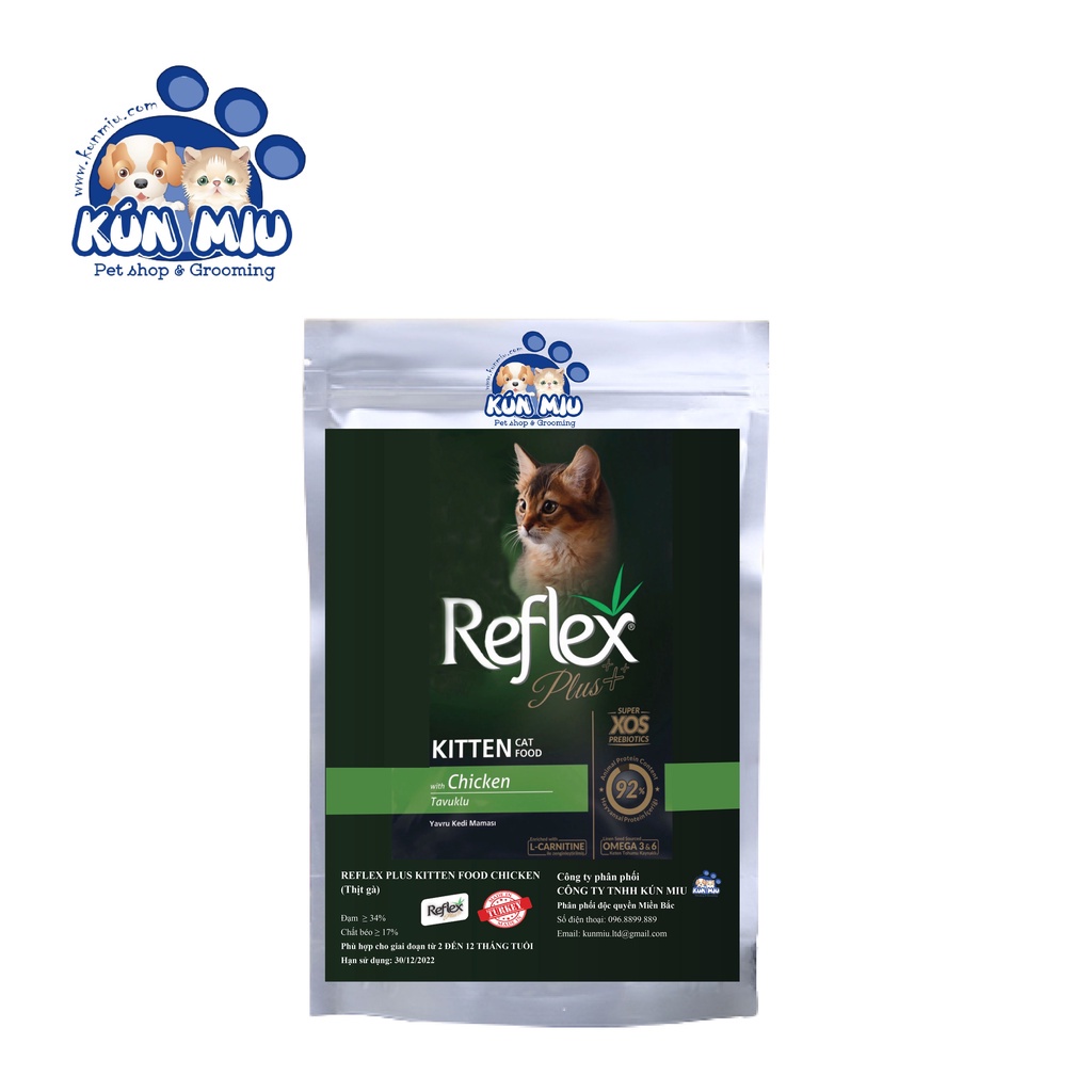 Thương hiệu REFLEX Xuất xứ TH Thổ Nhĩ Kỳ Nguyên liệu Thịt gà HDSD Dùng cho mèo con từ 0.5 - 3kg, cho mèo ăn trực tiếp Trọng lượng 1,5kg và 8kg Lưu ý Bảo quản ở nơi thoáng mát