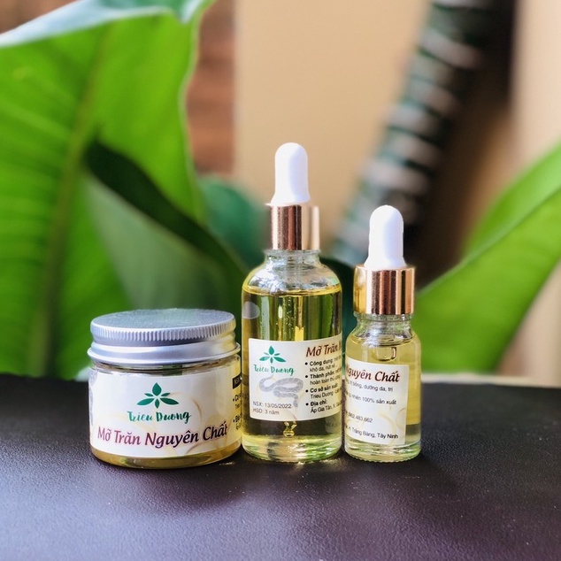 MỠ TRĂN : Mỡ trăn từ lâu đã được sử dụng rộng rãi cho làm đẹp, dưỡng da, sử dụng cho da khô, da nứt nẻ.... Cơ sở sản xuất của chúng tôi sản xuất hoàn toàn thủ công với thành phần 100% là mỡ trăn nguyên chất, nên mọi người hoàn toàn có thể yên tâm về chất lượng sản phẩm. Dung tích: 50ml Màu sắc: có màu vàng nhạt. Mùi: Nồng nhẹ, hơi tanh của mỡ trăn
