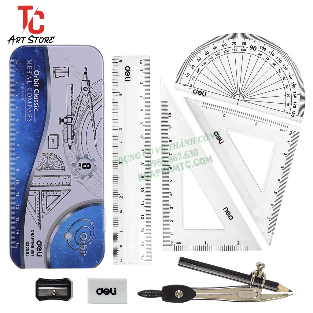 Bộ compa Deli G30505 hộp thiếc (8món) ( 3 Thước, bút chì, tẩy, gọt, compa, chuốt) Bộ Dụng Cụ Học Sinh 09 Món - Deli G30305 gồm 2 thước ê-ke 1 thước dài 15 cm 1 thước đo độ 1 compa 1 bút chì gỗ gắn compa 1 gôm 1 đồ chuốt làm bằng nhựa tốt.