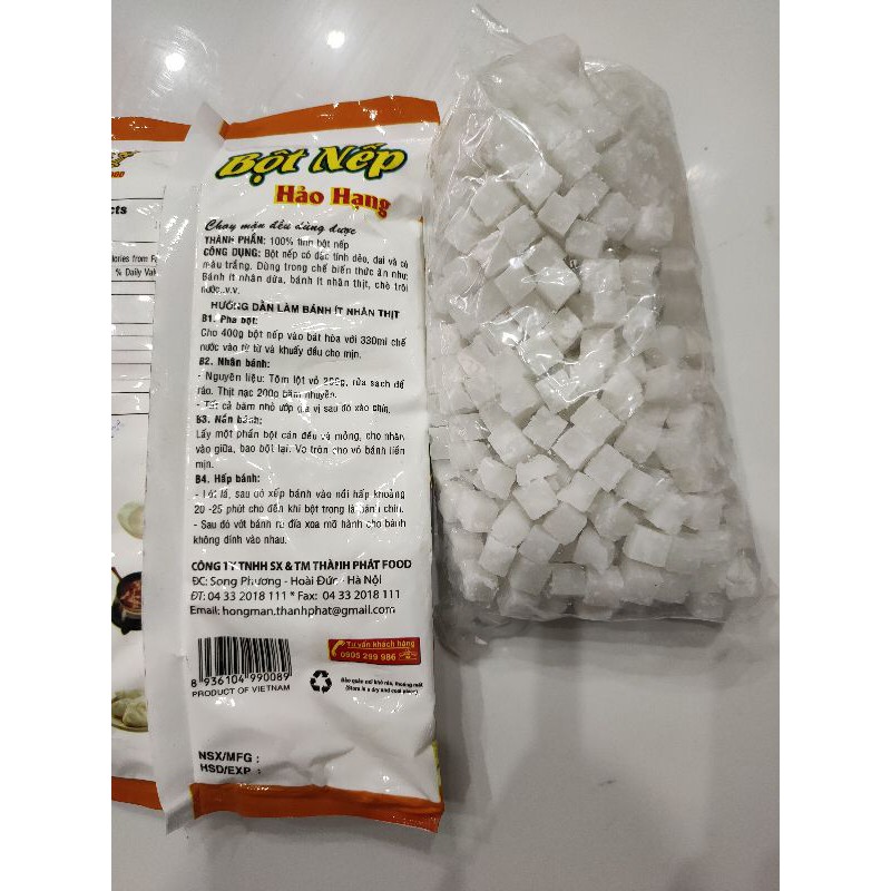 Thường được gọi tắt là “Bột nếp”, là loại bột được xay từ hạt gạo nếp (gạo dùng để nấu các món xôi). Bột có đặc tính dẻo, dai, có màu trắng tự nhiên của nếp. Bột gạo nếp thường được sử dụng trong nhiều các công thức bánh khúc, bánh rán (ngọt), bánh rán (mặn), bánh gai, Daifuku,.... Thành phần: 100% bột gạo nếp Hạn sử dụng: 12 tháng. Ngày SX. mới nhất Hướng dẫn sd. b1/ cho 400g bột nếp vào bát hoà với 330ml chế nước vào từ từ và khuấy đều cho mịn. b2/ tôm lột vỏ 200g, rửa sạch để ráo. thịt nạc 200g băm nhuyễn. tất cả băm nhỏ ướp gia vị sau đó sào chín. b3/ lấy phần bột cán đều và mỏng, cho nhân vào giữa, bảo bột lại. Vo tròn cho vỏ bánh liền mịn. b4/ hấp bánh. lót lá, sau đó xếp bánh vào nồi hấp khoảng 20 đến 25 phút cho đến khi bột trong lá bánh chín. sau đó vớt bánh ra đĩa xoa mỡ hành cho bánh ko dính vào nhau.