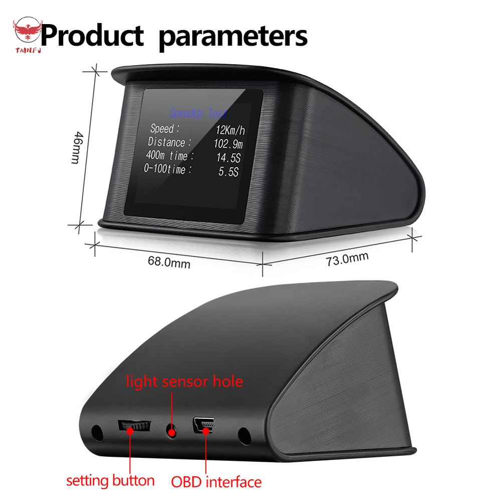 _____________Welcome to TMNFJ, we will provide quality products!_____________ Decription: Features: 1. Available for cars with OBD2 and EUOBD port(Car automatic diagnosis system) ,plug and play 2. TFT LCD multi color smart display 3. The first scan will show the vehicle protocol 4. The language can be changed 5. Multi function display mode or simple function display mode can be switched freely 6. Add new functions: accelerating competitive mode ,Brake performance test, can read the entire car data stream information 7. Rich Contents:vehicle speed,engine RPM,water temperature,voltage,instantaneous fuel consumption,average fuel consumption,driving distance measurement,driving time ,low voltage alarm,high water temperature alarm,over speed alarm, engine fault code alarm, eliminate the fault code,freely switch between kilometers&miles. Technical Parameters: Environment temperature: -40 + 80 degree atmospheric pressure 86-106KPa Relative Humidity: 10% -95% environmental noise: ≤60dB (A) Alarm sound level: ≥30dB (A) Working voltage: 9V ~ 16Vdc (12Vdc / 400mA) Product size: 73 x 68 x 46(cm) Included: 1 x HUD Car Head Up Display 1 x Anti Slip Pad 1 x OBD Cable 1 x User Manual