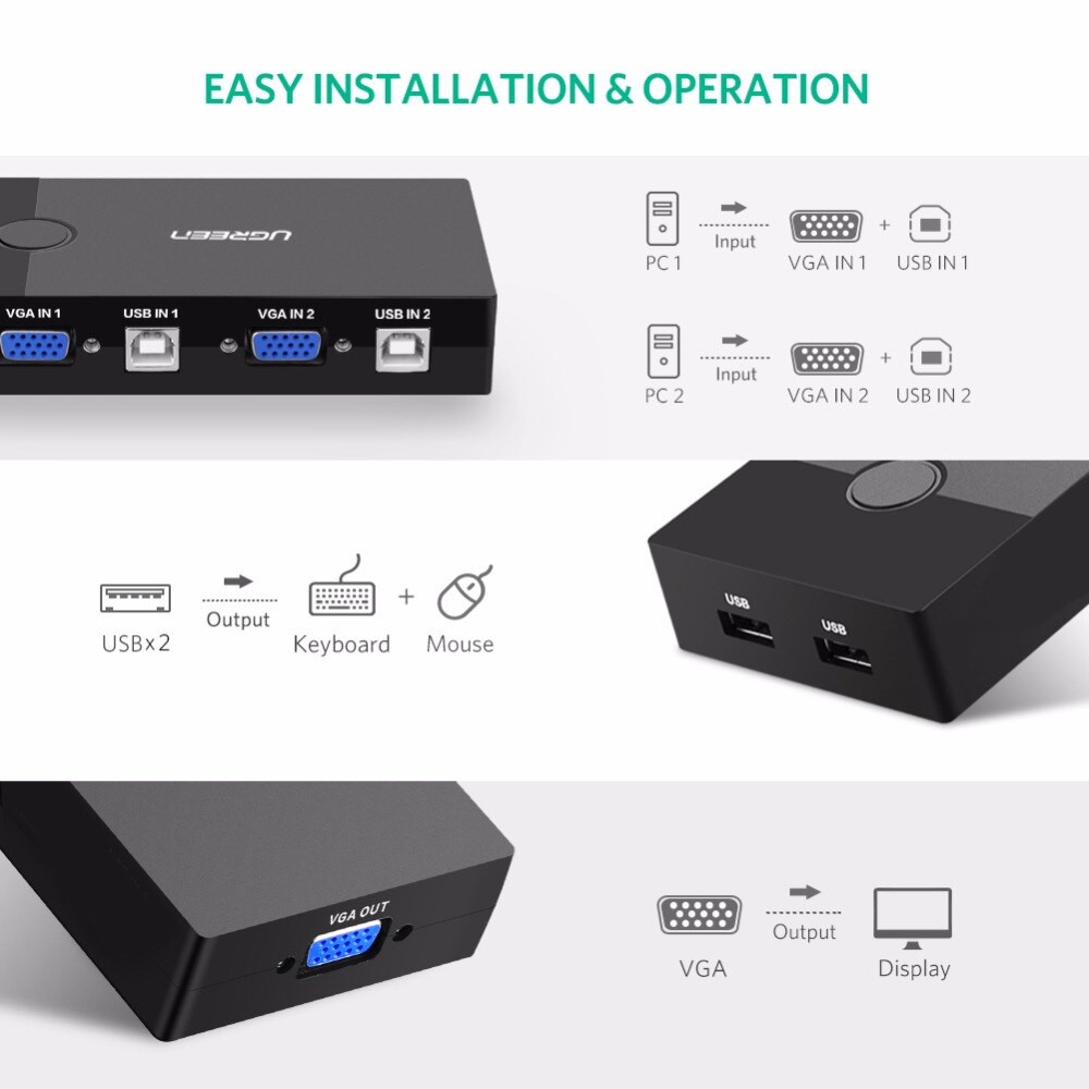 Mô tả sản phẩm Đa tác vụ Bộ chuyển đổi Ugreen USB VGA KVM cho phép bạn dùng chung một bàn phím USB, chuột USB và màn hình VGA để điều khiển 2 máy tính. Sản phẩm được thiết kế để bạn thực hiện đa nhiệm với hai máy tính một cách thuận tiện, giúp tăng năng suất tại văn phòng hoặc tại nhà; Bạn có thể chuyển đổi giữa 2 máy tính bằng cách sử dụng công tắc thủ công nằm trên đỉnh của thiết bị KVM.