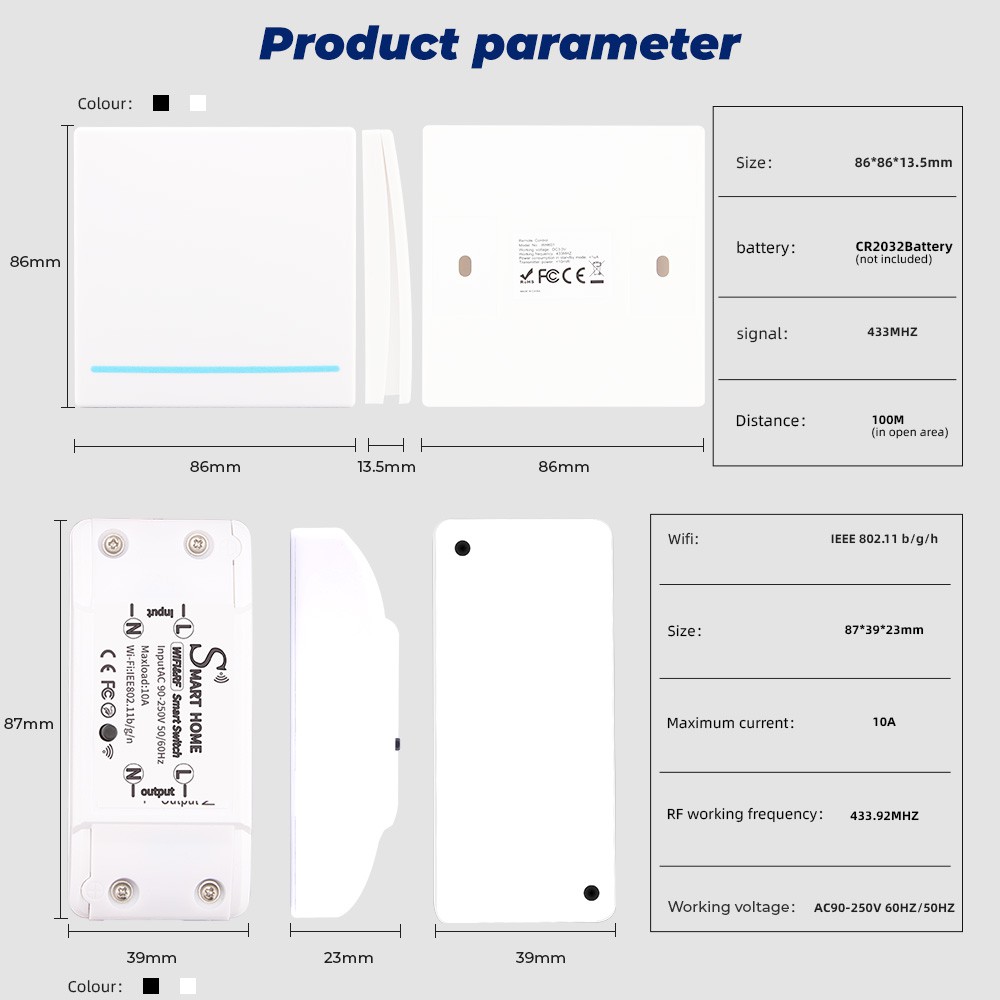 Điện áp làm việc: AC90-250V 60HZ / 50HZ wifi: IEEE 802.11 b / g / n Tần số làm việc: 433MHZ Kích thước: 87 * 39 * 23mm Dòng điện tối đa: 10A màu sắc: Đen / trắng Thông số công tắc không dây: