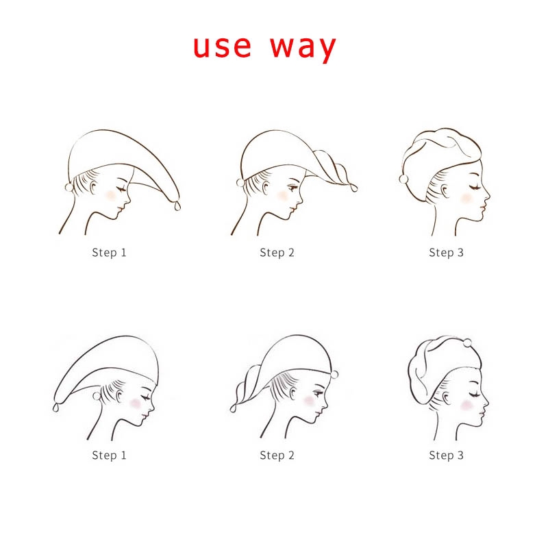 How to use? (2 Method) 1. Bend to make your hair hang down, put on hair towel on top of head (the end with button) 2. Wrap your hair with the hanging part of the towel 3. Pull up the secure loop across your head and fix it under the secure button.