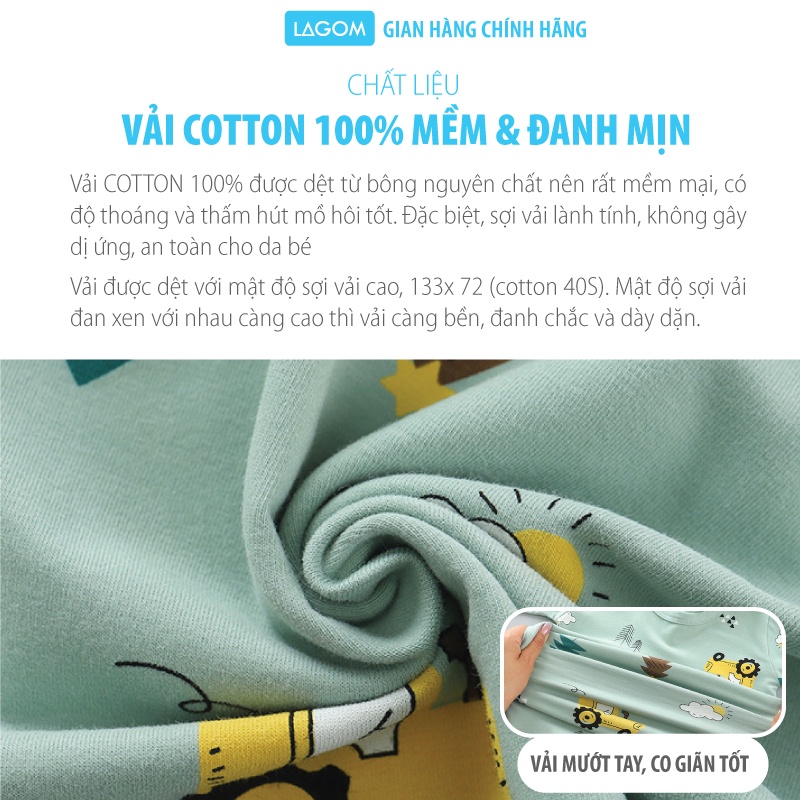 ✨ Chất liệu COTTON cao cấp, mềm & đanh mịn: - Bộ thu đông cho bé của LAGOM sử dụng chất vải COTTON 100% được dệt từ bông nguyên chất nên mềm mại, và thấm hút mồ hôi tốt. Đặc biệt, sợi vải lành tính, không gây dị ứng, an toàn cho da bé nên mẹ hoàn toàn yên tâm khi chọn mua cho bé nhé! - Bề mặt vải đanh mịn, mướt tay - Vải co giãn 4 chiều, bé thoải mái vận động khi mặc. - Vải cotton của LAGOM được dệt với mật độ sợi vải cao, 133x 72 (cotton 40S) nên dày dặn, đanh chắc và bền. Mật độ sợi vải đan xen với nhau càng cao thì vải càng bền, đanh chắc và dày dặn. - Quy trình in, nhuộm hiện đại, cam kết không phai màu.