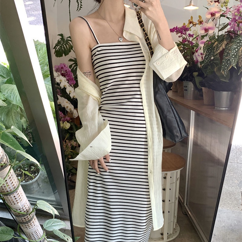 Giới thiệu COZOK Set Đầm Kẻ Sọc + Áo Khoác Cardigan Dài Tay Chống Nắng Cao Cấp Thời Trang