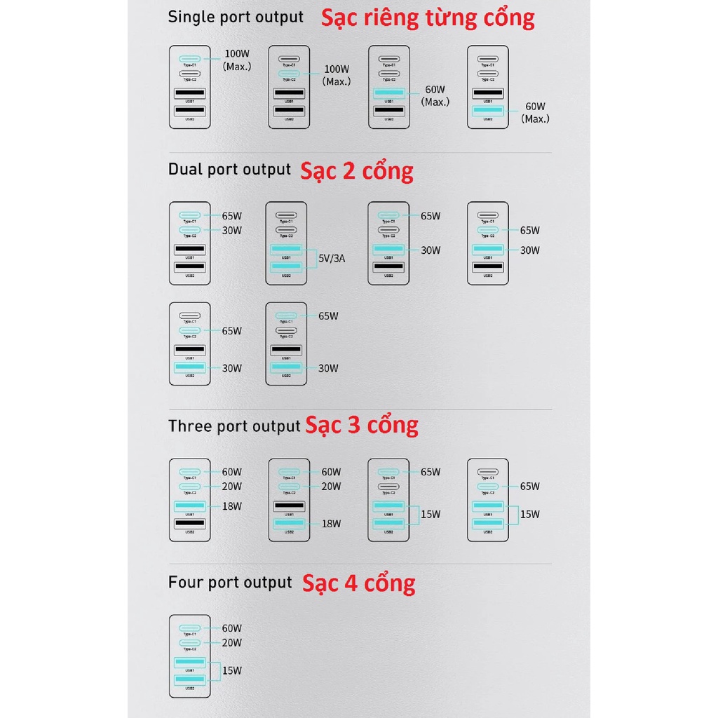 Thông tin sản phẩm - thương hiêu: Baseus - mã sản phẩm: Baseus ccGAN100us - công suất sạc tối đa của cốc sạc: 100W - output 4 cổng: 2 Type-C & 2 usb-A - sạc nhanh tích hợp: PD, QC, Samsung 45W - cấu hình sạc: Type-C1/Type-C2: 5v-3a, 9v-3a, 12v-3a, 15v-3a, 20v-5a (max 100W) Usb-A1/Usb-A2 : 5v-3a, 9v-3a, 12v-3a, 20v-3a (max 60W) - công suất sạc từng cổng trong những tình huống khác nhau: *C1 /C2 = 100W *A1/A2 = 60W * C1+C2 = 65W+30W hoặc 30W+65W * A1+ A2 = 15W * C1/C2 + A1/A2 = 65W+30W * C1+C2+ A 1/A2 = 60W+20W+18W * C1+C2+(A1+A2) = 60W+20W+15W * C1/C2+(A1+A2) = 65W+15W • Kèm cáp C to C 5A 100W dài 1m, dây nhựa.