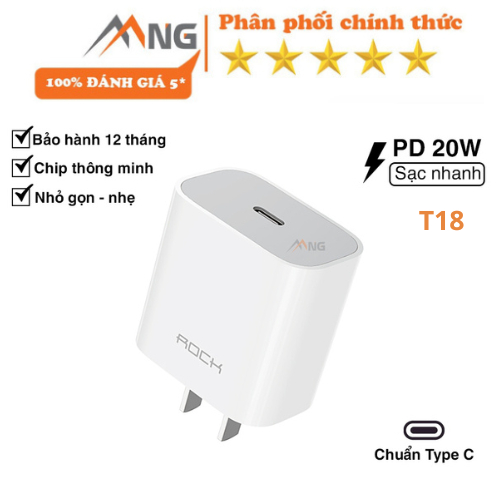 Điện Thoại & Phụ Kiện > Pin Gắn Trong, Cáp và Bộ Sạc > Cáp Sạc và đầu chuyển đổi > Củ sạc nhanh chuẩn PD 20W Rockspace T18 cổng Type C không nóng máy - hàng chính hãng bảo hành 12 tháng