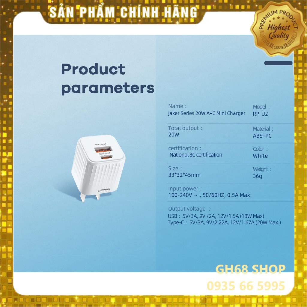 Điện Thoại & Phụ Kiện > Pin Gắn Trong, Cáp và Bộ Sạc > Cốc/Bộ sạc > [Mã ELMS10 giảm 6% đơn 50K] Củ Sạc Sạc Nhanh 20W Remax RP-U2 Tích Hợp 2 Cổng Sạc Nhanh PD Type C + USB Thiết Kế Nhỏ Gọn