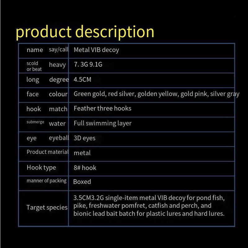 Tính năng ' Đầu móc sắc bén , với sức mạnh giết người gấp đôi và không thể thoát ra ngoài . Khoảng cách ném xa , xem đầy đủ nước bay. chụp chính xác hơn . Bề mặt cá 360 °, Phản xạ độ nét cao. đau phun ba chiều. đầy quyến rũ và độ phản xạ cao, Cá mô phỏng cao. tự do chìm. với phong cách bơi lội quyến rũ . Được ghép nối với BKK ba móc , nó có thể nhanh chóng đảo ngược và xử lý một cách dễ dàng . Thông số kỹ thuật ' Chất liệu kim loại Gói bao gồm ' 1 x mồi câu cá Ghi chú ' Do độ sáng của màn hình và độ sáng của ánh sáng và nhiều yếu tố khác , màu sắc thực của hàng hóa có thể hơi khác so với màu trên hình ảnh . Vui lòng cho phép sai lệch nhỏ trong dữ liệu đo lường .