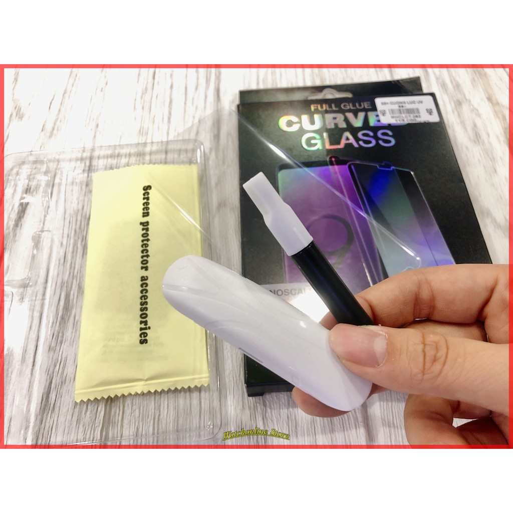 - Kính cường lực Curved chỉ mỏng 0.33 mm không làm mất sự thanh mảnh của màn hình điện thoại. - Khi dán kính cường lực Curved bạn vẫn có thể sử dụng cùng ốp lưng Spigen, UAG mà không sợ bị bong. Kính cường lực full keo UV Galaxy Các bước dán kính cường lực full keo UV Galaxy Bạn hoàn toàn có thể đặt mua Kính cường lực tại Shop và tự dán tại nhà qua các bước đơn giản sau đây: - Bước 1: Vệ sinh màn hình điện thoại Samsung S bằng bộ vệ sinh màn hình thật sạch - Bước 2: Bóc lớp nilon ở dưới tấm kính ra lấy được tấm kính trong suốt - Bước 3: Đổ keo vào chính giữa màn hình hoặc đổ chính giữa của 2 nửa màn hình, tầm 1/2 lọ keo là đủ cho 1 máy - Bước 4: Đợi tầm 2 phút cho keo nước tràn phủ kín màn hình máy Samsung , lưu ý ko tì lên trên bề mặt màn hình mà để keo tự chạy hết, nếu keo chẩy ra khỏi viền màn hình, dùng khăn khô lau sạch, chỉnh cho tấm dán đặt cân chính giữa màn hình - Bước 5: Dùng đèn chiều tia UV chia màn hình máy thành 4 phần sau đó chiếu mỗi phần 10 giây, làm 2 lượt, đảm bảo keo khô hết, vô cùng chắc chắn.