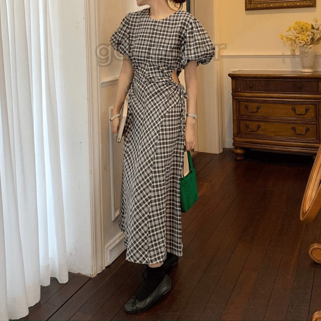 Giới thiệu D5|Đầm nữ mùa hè khoét eo cổ tròn dây rút hoạt tiết caro nhẹ nhàng gd_order