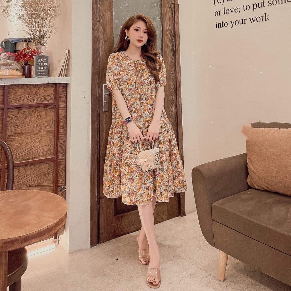 Giới thiệu Đầm bầu thời trang thiết kế xinh xắn nơ ngực MSP329 vải lụa hoa Mom and Baby