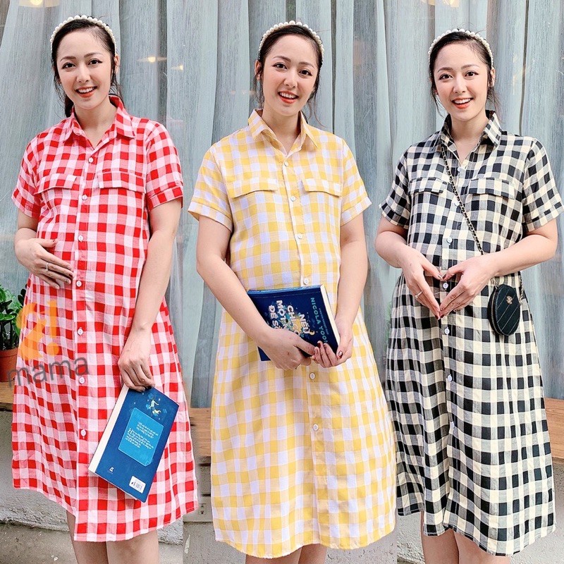 Giới thiệu Đầm bầu, váy bầu thiết kế dáng sơmi kẻ lịch sự trẻ trung, chất liệu đũi Hàn mềm mát V10