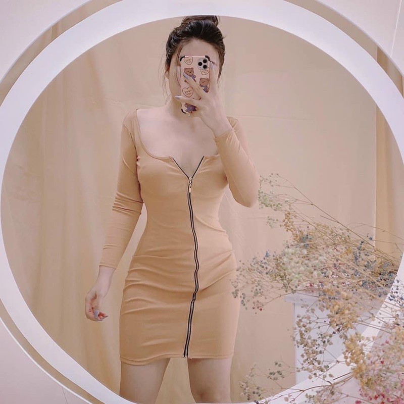 Giới thiệu ✨ Đầm Body Tay Dài Cổ Vuông Dây Kéo Ngực Thun Gân