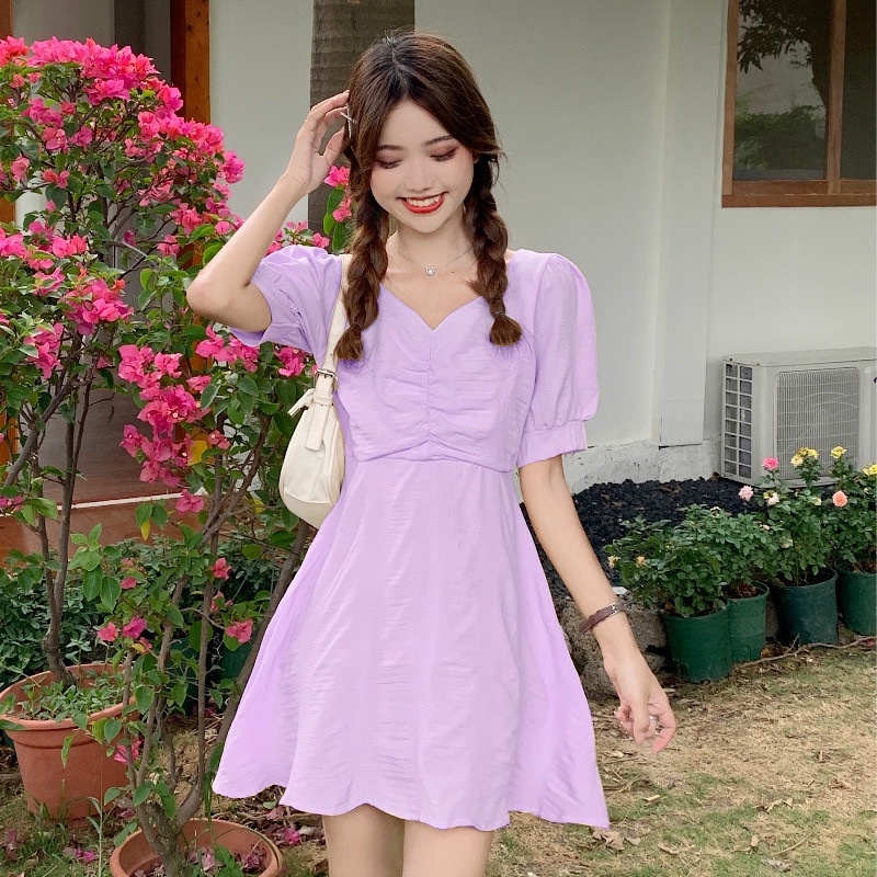 Giới thiệu Đầm Chữ A Màu Trắng Trơn Tay Phồng Cổ Chữ V Lưng Đan Chéo Thời Trang Pháp Cho Nữ