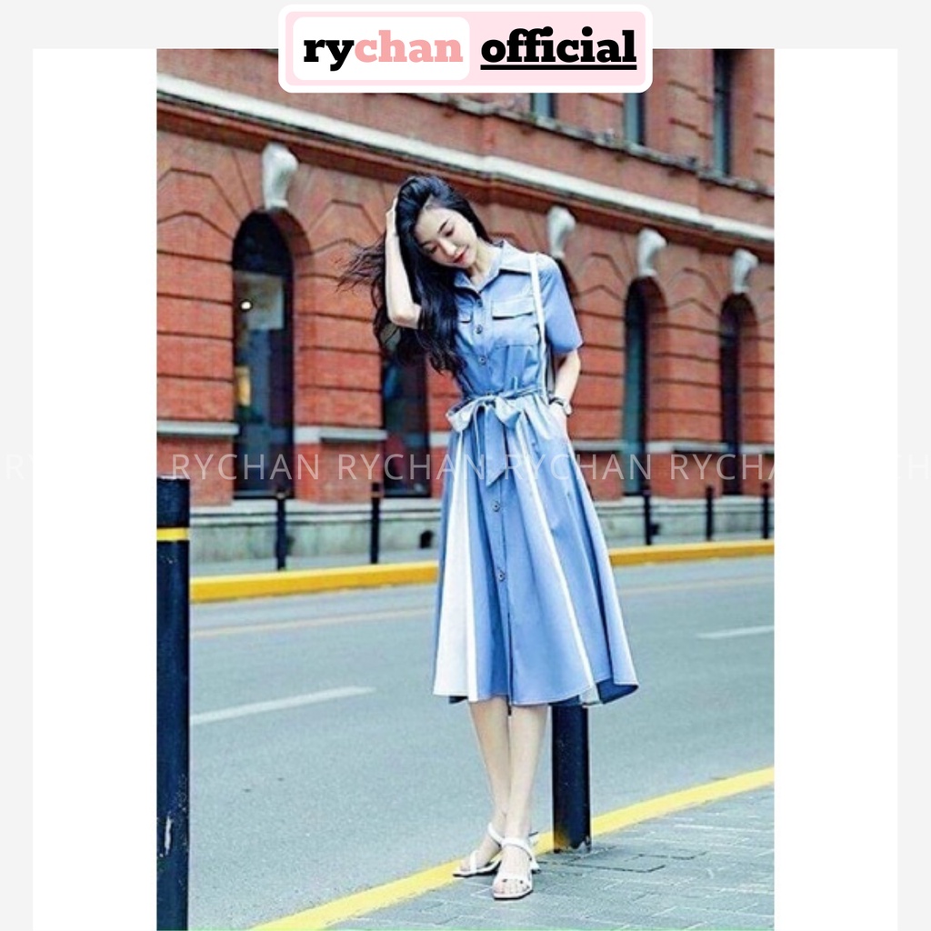 Giới thiệu Đầm Công Sở Cổ Sơ Mi Túi Hộp Thắt Eo Đuôi Phối Màu Xanh Trắng Cực Lạ Mắt - DX9925