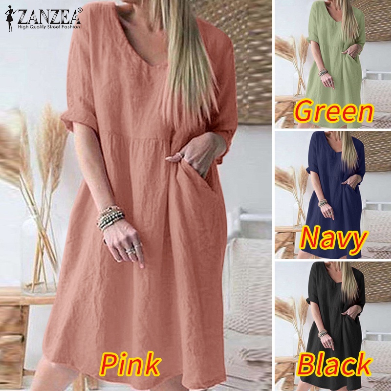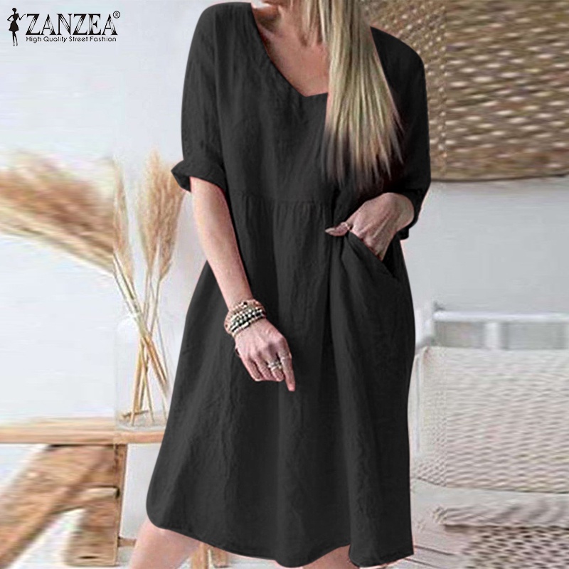 Giới thiệu Đầm cotton ZANZEA tay lửng cổ chữ V dáng rộng phối túi phong cách châu Âu