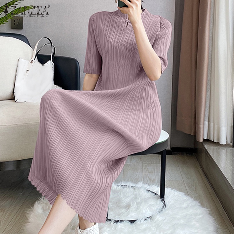 Giới thiệu Đầm dài ZANZEA cổ chữ V tay lửng xếp ly màu trơn thời trang công sở nữ tính