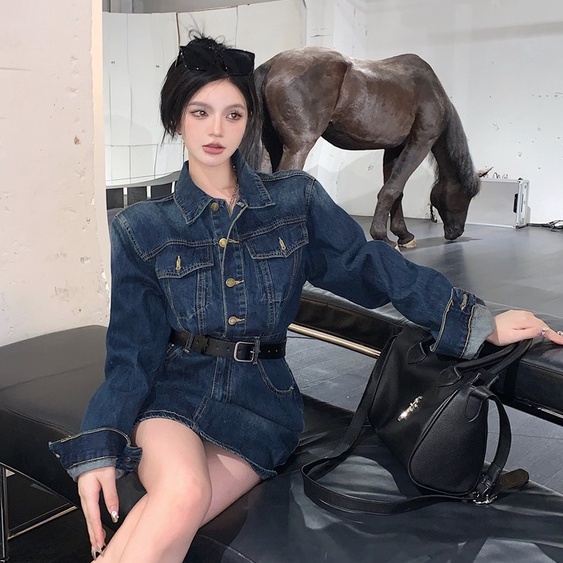 Giới thiệu Đầm Denim Tay Dài Ôm Eo Cài Một Hàng Khuy Thời Trang Mùa Thu Phong Cách Hàn Quốc Cho Nữ