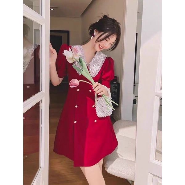 🍀 ĐẦM ĐỎ PHỐI REN CỔ ĐÍNH 6 NÚT 💖
