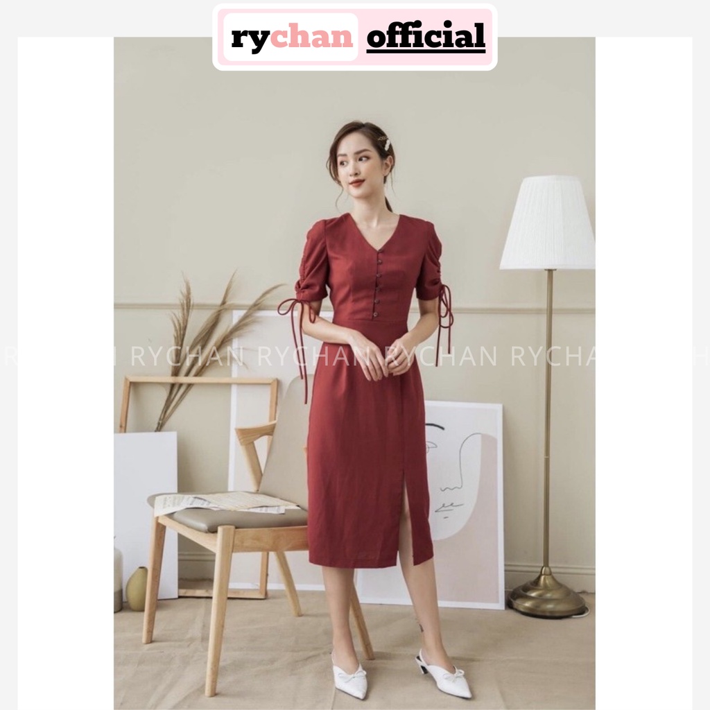* Chi tiết sản phẩm Đầm Nữ Dự Tiệc Cổ V Nút Trước Tay Ngắn Nơ Xẻ Tà Cực Sang Trọng Màu Đỏ Trắng :