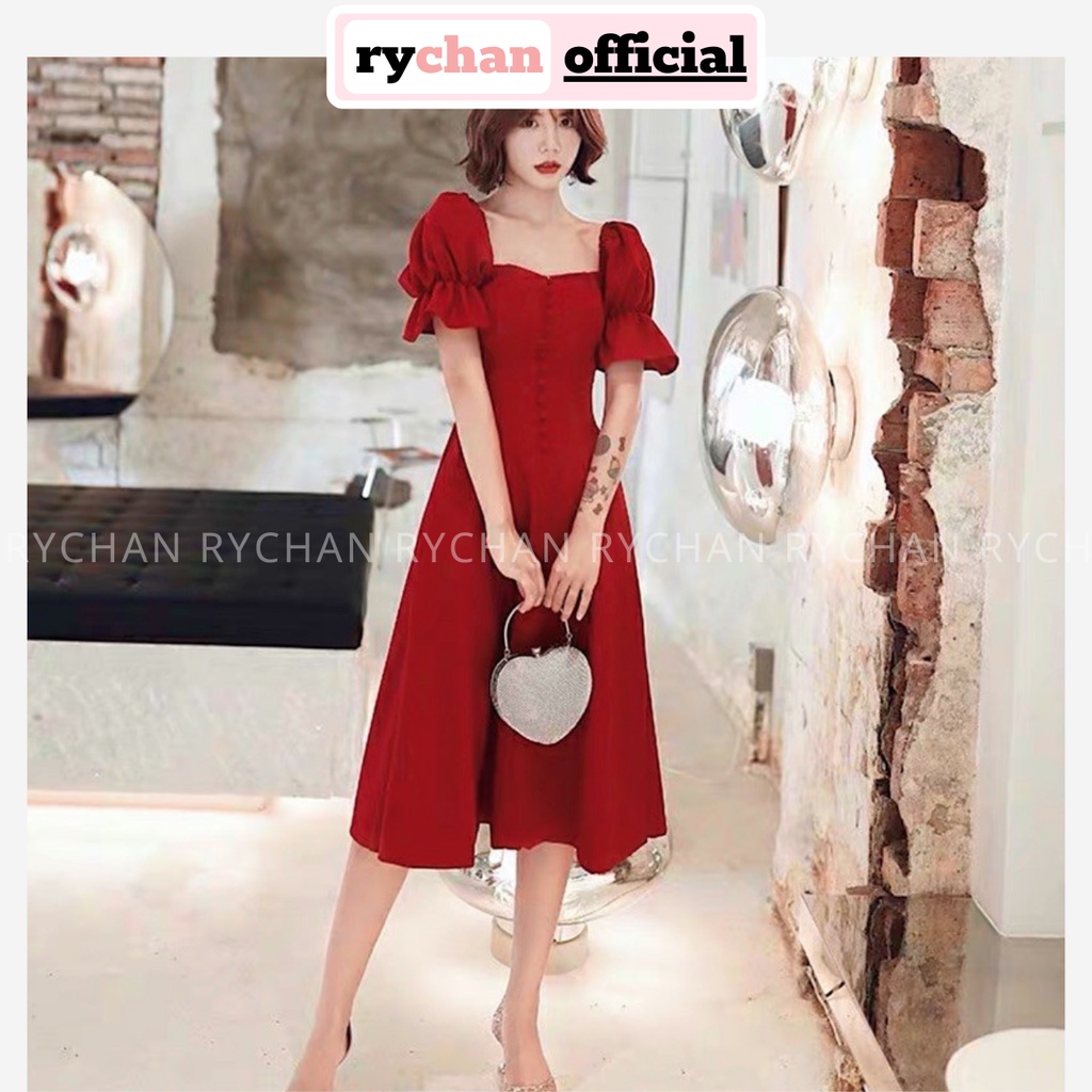 * Chi tiết sản phẩm Đầm Nữ Dự Tiệc Cưới Sang Chảnh Cổ Vuông Tay Bo Bèo Cực Tôn Da, Đầm Xinh Màu Trắng Đỏ :