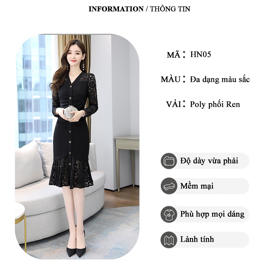 1. Chi tiết sản phẩm: Đầm công sở WOBE HAPPY MAMI HN05 - Chất liệu: Poly phối ren - Đặc tính: Giặt không xù lông hay bay màu, thấm hút mồ hôi tuyệt đối tạo cảm giác dễ chịu khi sử dụng. - Form váy: Đuôi cá - Chiều dài váy: 105cm. 2. Màu sắc: Đen + Xanh 3. Size đầm: M L XL XXL - M < 50kg - L: 50~56kg - XL: 57~63kg - XXL: 64~70kg 4. Hướng dẫn sử dụng và bảo quản: - Giặt ở nhiệt độ bình thường, với đồ có màu tương tự. - Không được dùng hóa chất tẩy. - Hạn chế sử dụng máy sấy và ủi ở nhiệt độ thích hợp. - Lộn mặt trong của váy ra ngoài khi phơi tránh bị phai màu 5. Chính sách và điều kiện đổi trả của WOBE: - Cam kết chất lượng và mẫu mã sản phẩm giống với hình ảnh. - Cam kết được đổi trả hàng trong vòng 7 ngày. - Hàng phải còn mới, nguyên tem, mác - Sản phẩm bị lỗi do vận chuyển và do nhà sản xuất
