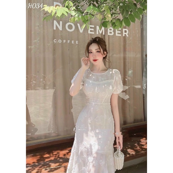 Giới thiệu Đầm dự tiệc trắng đuôi cá chất voan thêu nổi