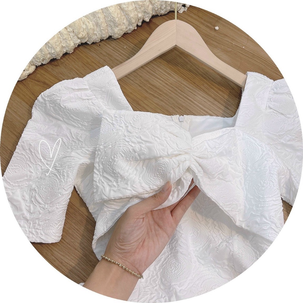 ĐẦM GẤM TRẮNG CỔ VUỐNG NHÍU NGỰCGiá BANX