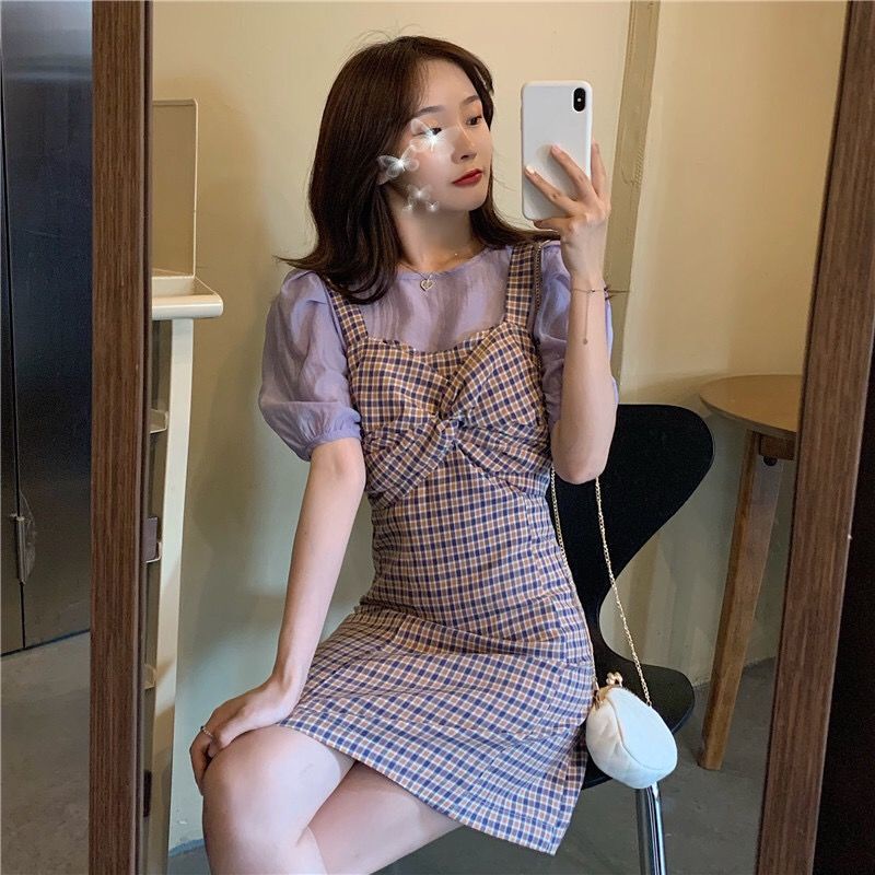 Giới thiệu Đầm Giả Hai Mảnh Tay Phồng Cổ Tròn Màu Tím Phong Cách Pháp Mới