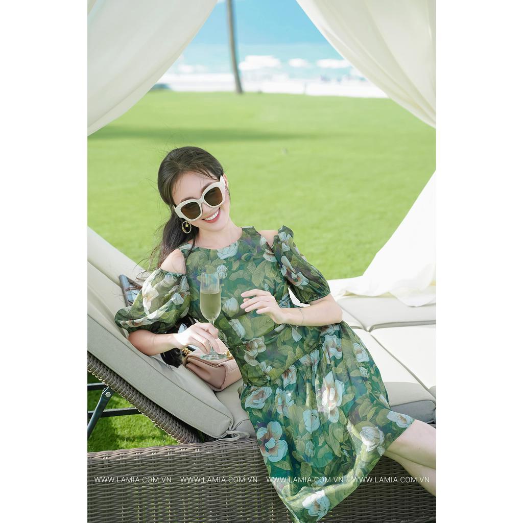 Giới thiệu Đầm hè Lamia Design LD190 họa tiết in hoa tơ nền xanh ngọc phối dáng cánh tiên sang trọng