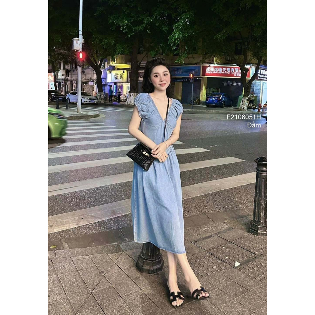 Đầm jean kiểu xòe dáng dài jean cổ tim!