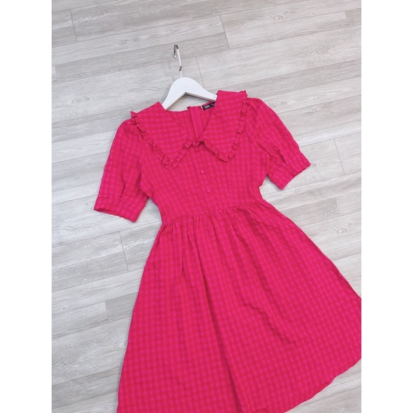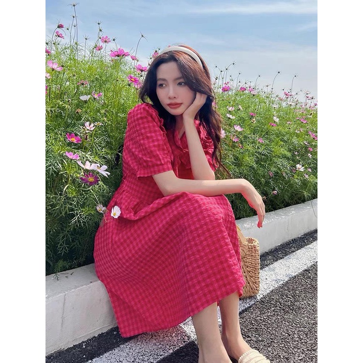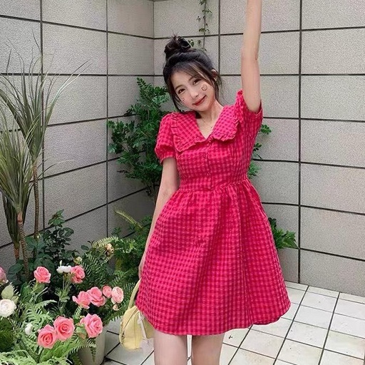 Giới thiệu Đầm kẻ hồng sen cổ bèo cúc bọc dáng ngăn