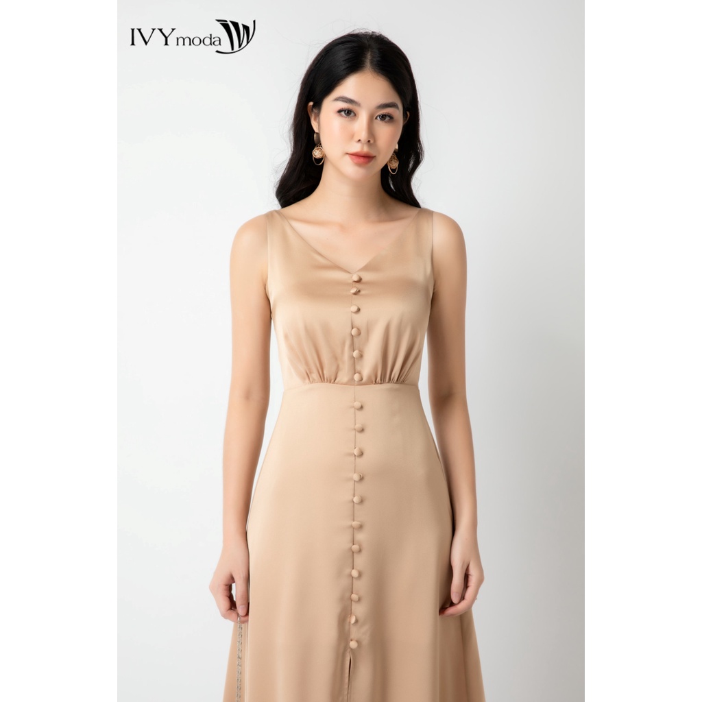 Đầm cổ tim, dáng không tay. Eo chiết. Có hàng khuy bọc vải phía trước. Tùng váy dài ngang bắp, xẻ gấu phía trước. Cài bằng khóa kéo ẩn sau lưng.