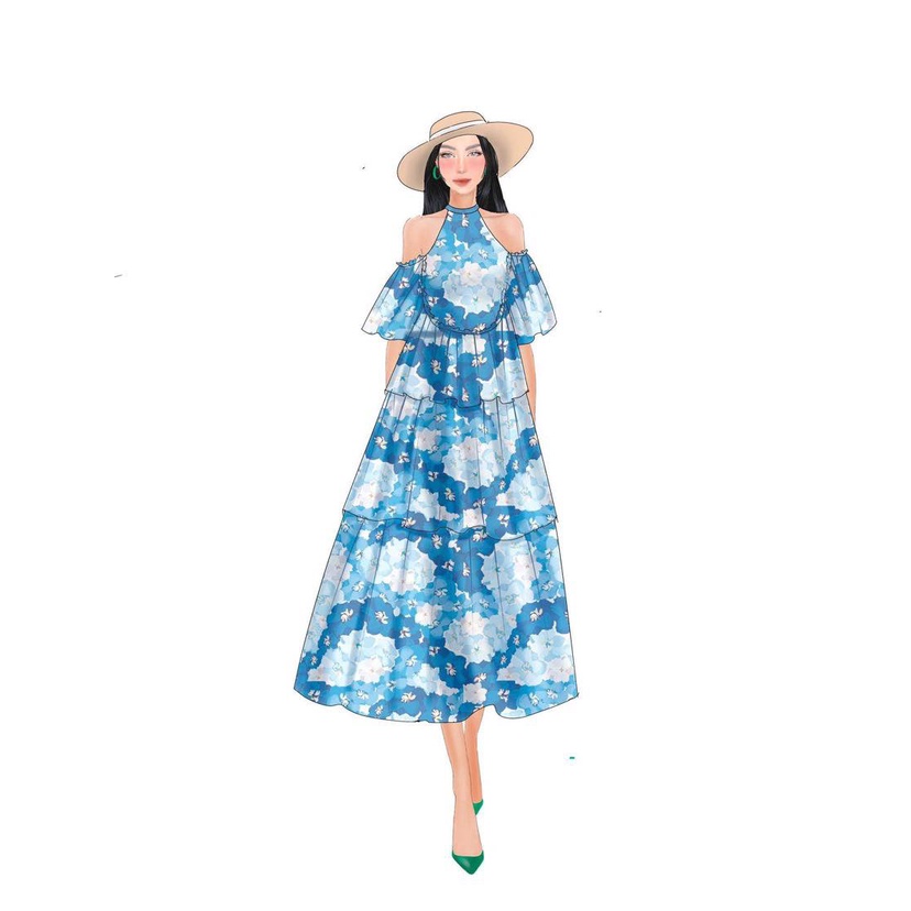 Giới thiệu Đầm maxi dài cổ yếm hở vai váy nữ vải tơ hoạ tiết bầu trời in thiết kế mặc đi chơi du lịch biển nghỉ mát resort dự tiệc