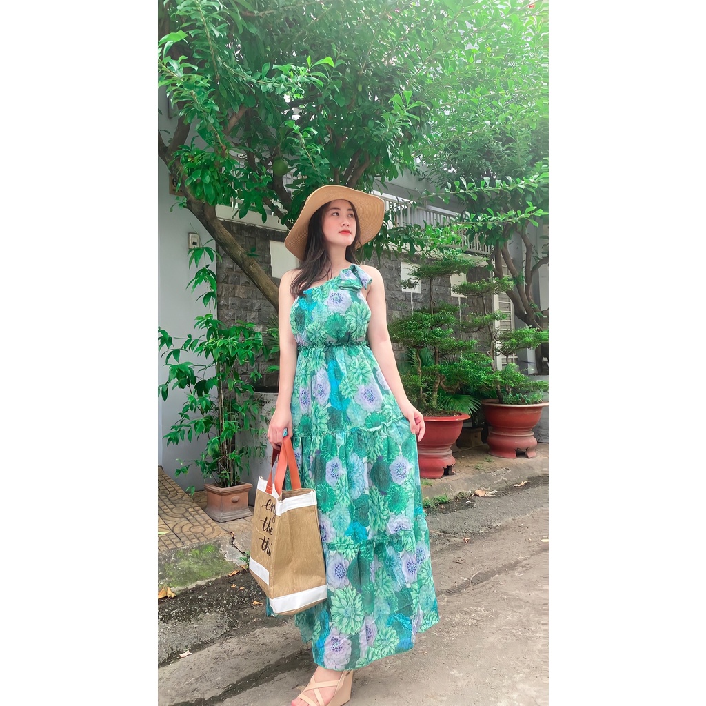 Đầm maxi lệch vai dáng xoè kèm nơ vai phong cách cá tính dễ thương váy maxi đi biển sang trọng hở lưng siêu xinh