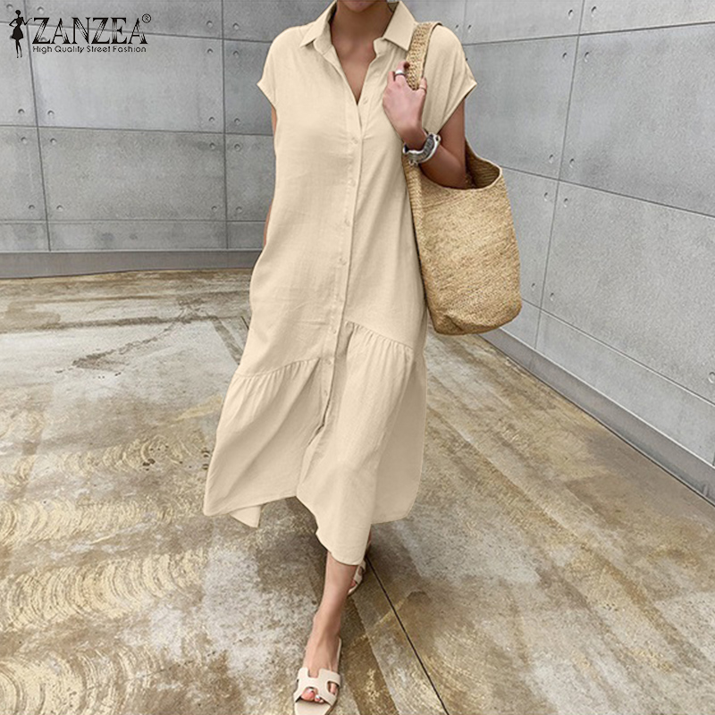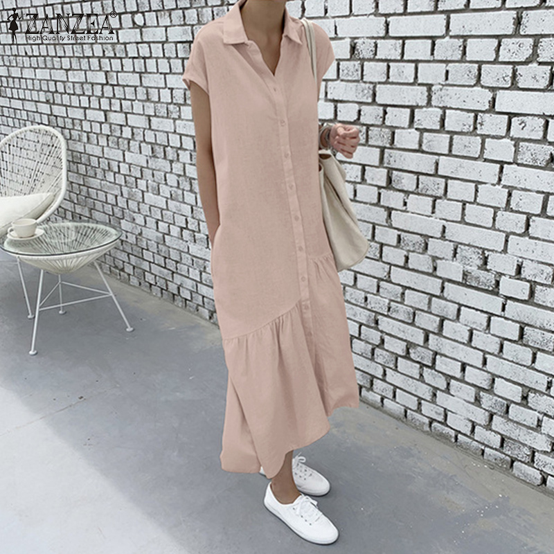 Giới thiệu Đầm Maxi ZANZEA Tay Ngắn Có Cổ Gài Khuy Xếp Ly Màu Trơn Đơn Giản Dành Cho Bạn Nữ