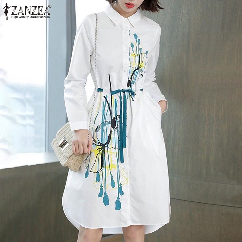 Giới thiệu Đầm midi ZANZEA tay dài cổ bẻ thắt eo in họa tiết thời trang cho nữ