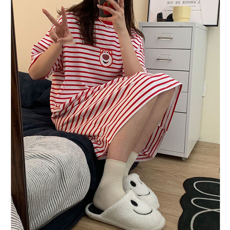 Giới thiệu Đầm Ngủ Kẻ Sọc Dáng Rộng In Hoạt Hình Gấu Và Dâu Tây Dễ Thương Thời Trang Mùa Hè Cho Nữ