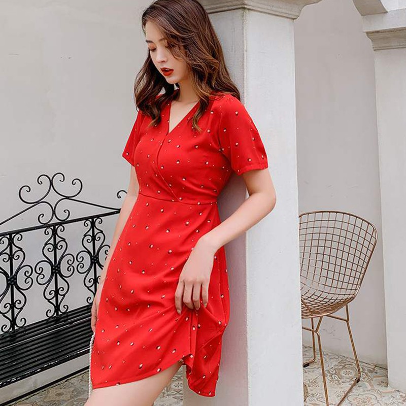 Giới thiệu Đầm nữ ngắn tay cổ chữ V in hoa eo thắt dây thời trang