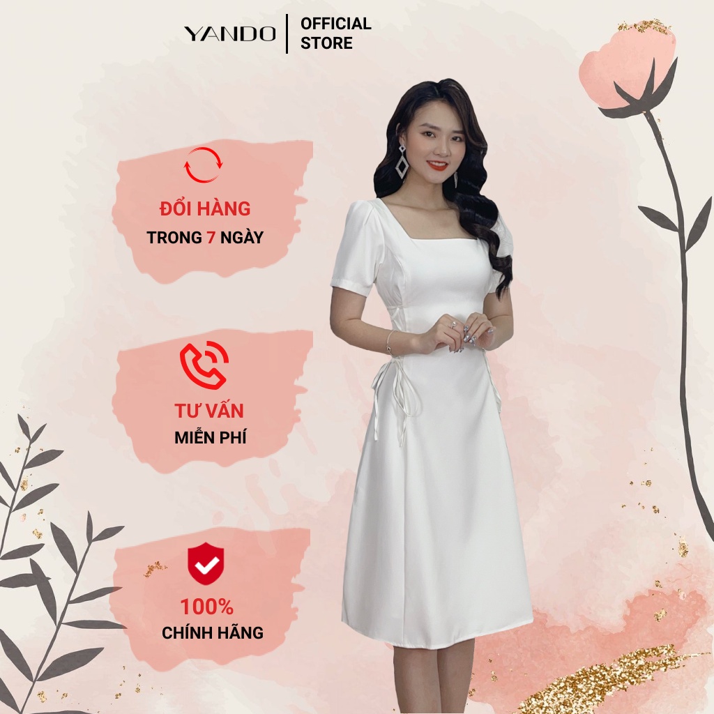 MÃ SẢN PHẨM: DA07 TÊN SP: Đầm Cổ Vuông Đan Dây Eo Cách Điệu YANDO Màu sắc: Trắng Size mẫu mặc: S Vòng ngực : 86 Vòng eo : 66 Vòng mông : 88 Chất liệu vải : Thun Mỹ