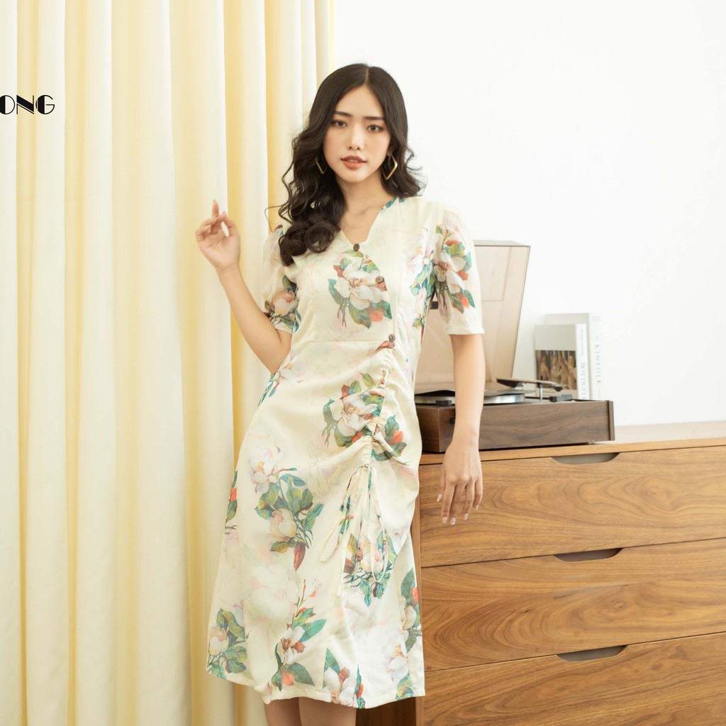 Giới thiệu Đầm nữ voan hoa vạt chéo rút dây tùng KAMONG D142