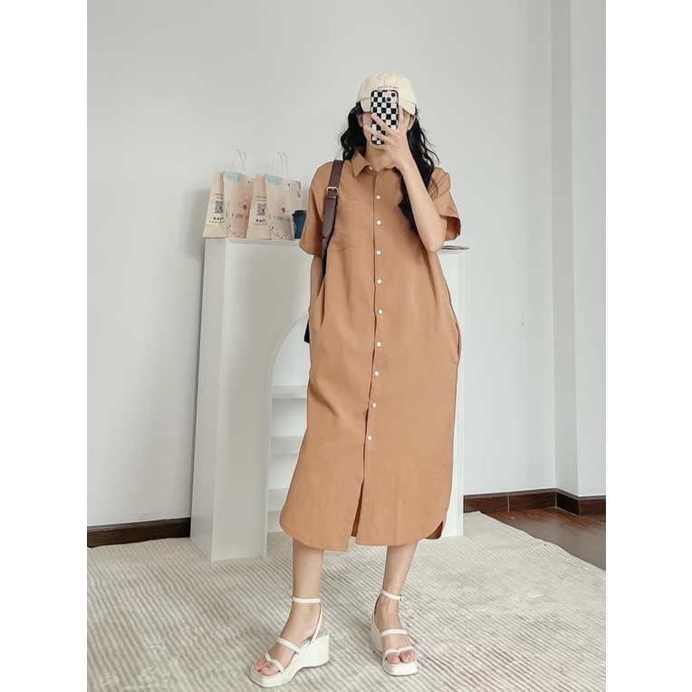 Đầm Sơ Mi Dáng Suông Dài Xẻ Tà Style Hàn Quốc Lên Dáng Siêu Xinh Dễ thương dạo phố form 40-60kg