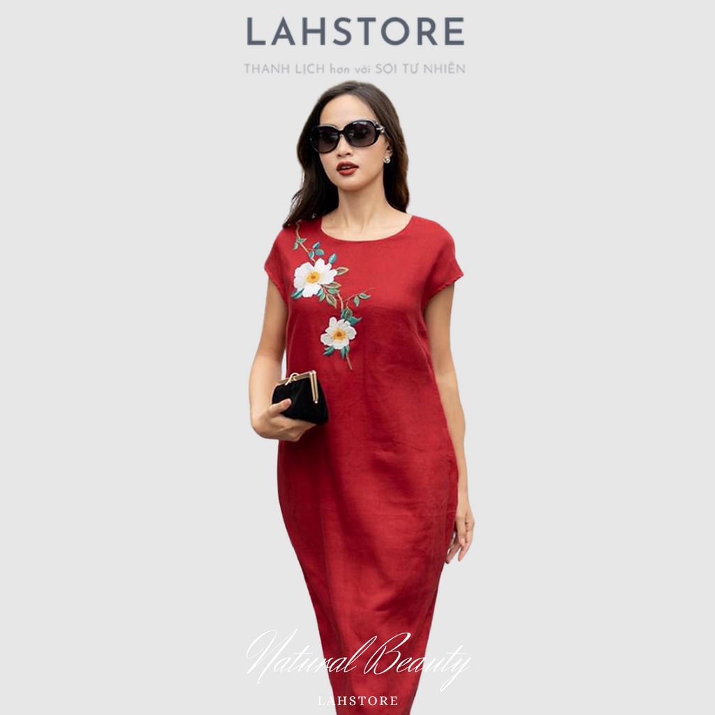 Giới thiệu Đầm suông linen trung niên LAHSTORE vải linen Hàn dày dặn, tay hến, thêu hoa (Đỏ Tươi)