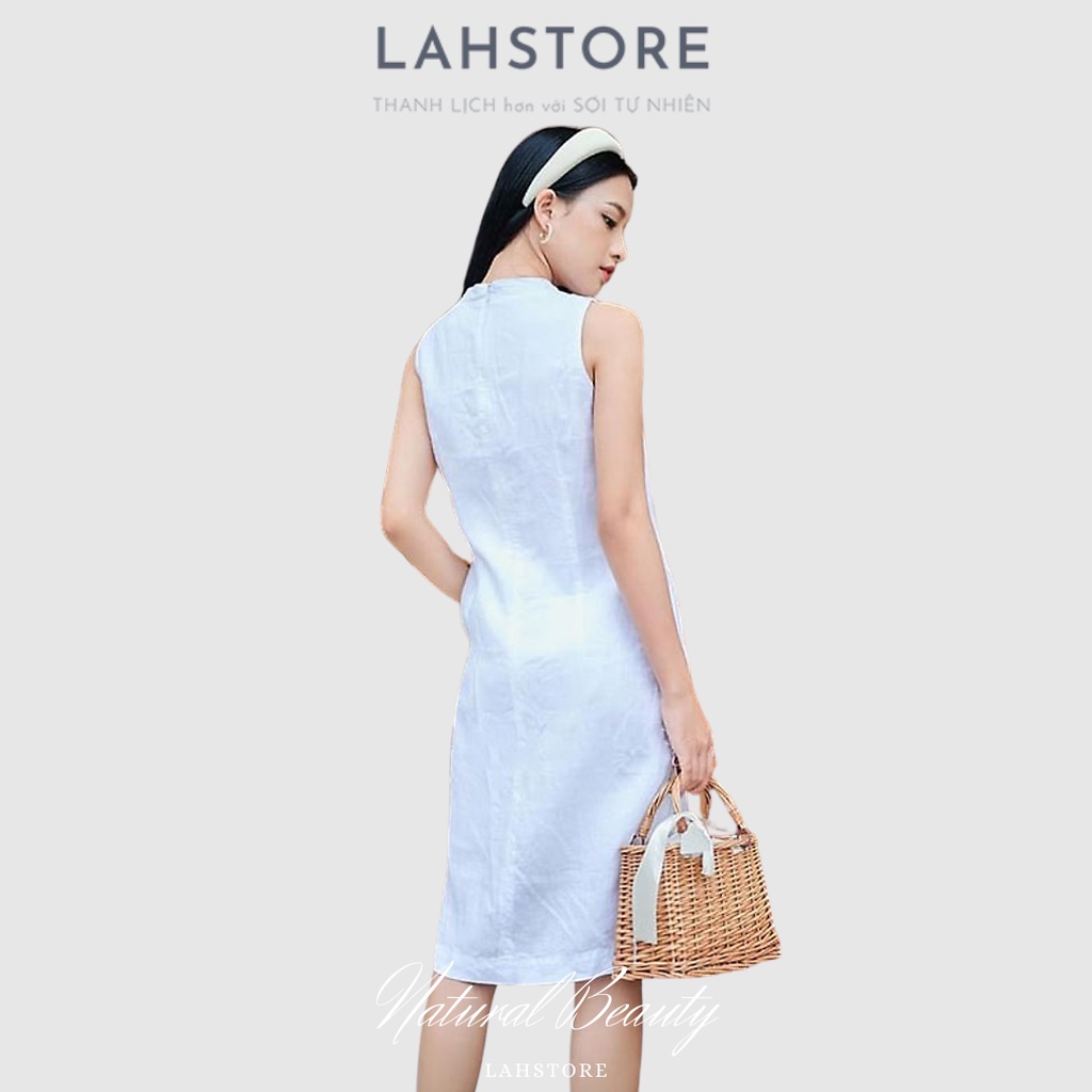 Đầm suông nữ giấu bụng 𝐋𝐀𝐇𝐒𝐓𝐎𝐑𝐄 vải linen tưng thêu hoa cổ tàu sát nách (Trắng)