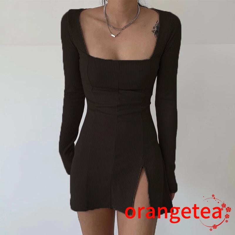 Giới thiệu Đầm Tay Dài Cổ Vuông Xẻ Tà Màu Trơn Thời Trang Cho Nữ