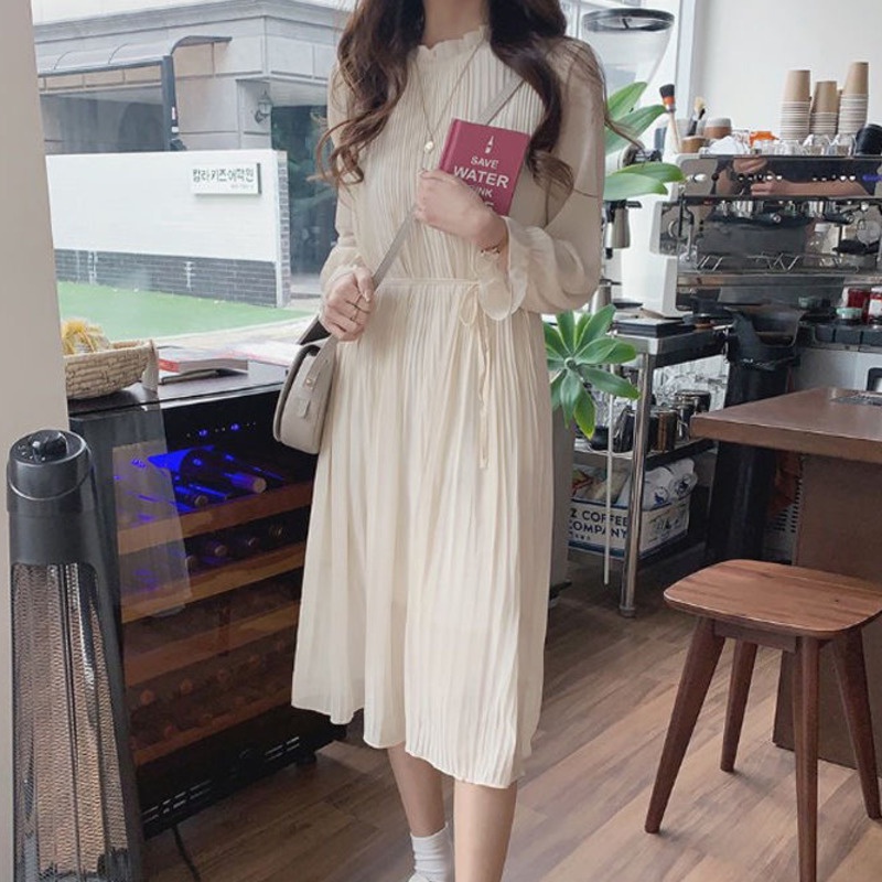 Đầm Tay Dài In Hình Hoa Chuông Kiểu Pháp Dễ Thương 164718 Chân Váy Chữ a Dài Vừa Phải Xếp Ly Thắt Dây Phong Cách Retro Siêu Nữ Tính