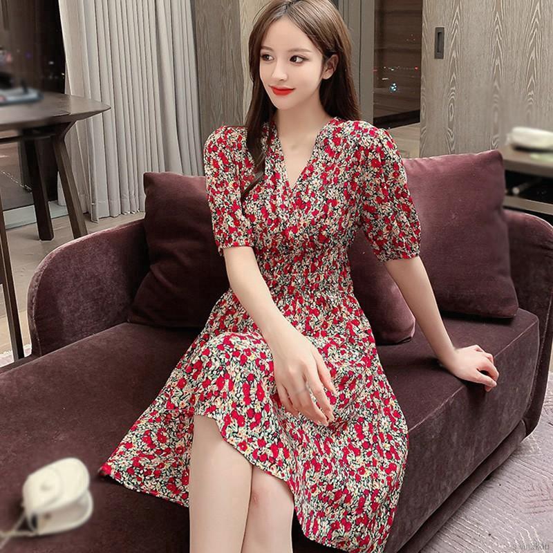 Giới thiệu Đầm Tay Ngắn Cổ Chữ V Hoạ Tiết Hoa Thiết Kế Dáng Chữ A Nữ Tính Váy Chân váy